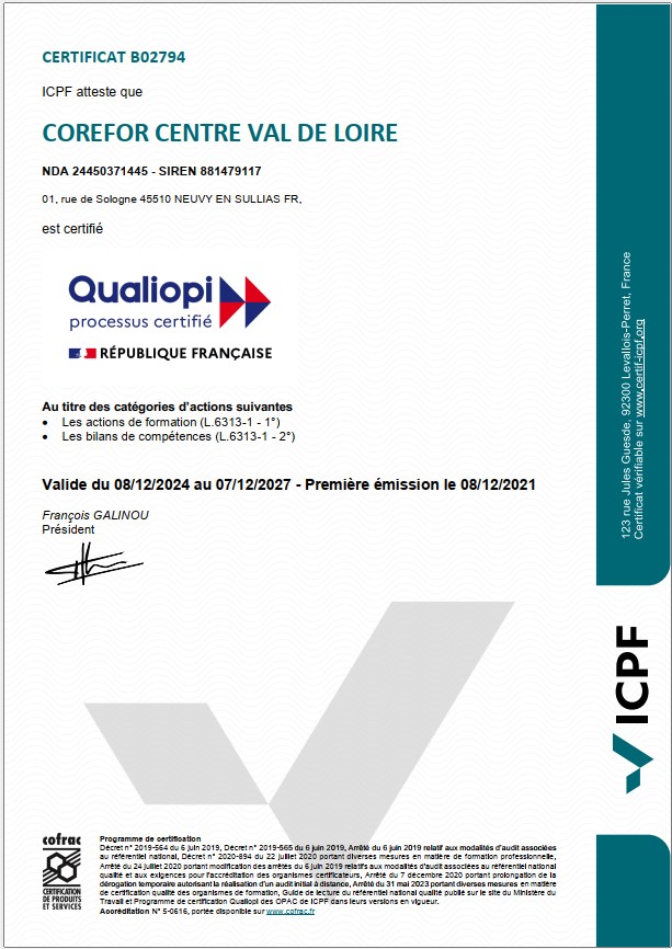 Corefor Centre-Val de Loire – Organisme de Formation certifié QUALIOPI