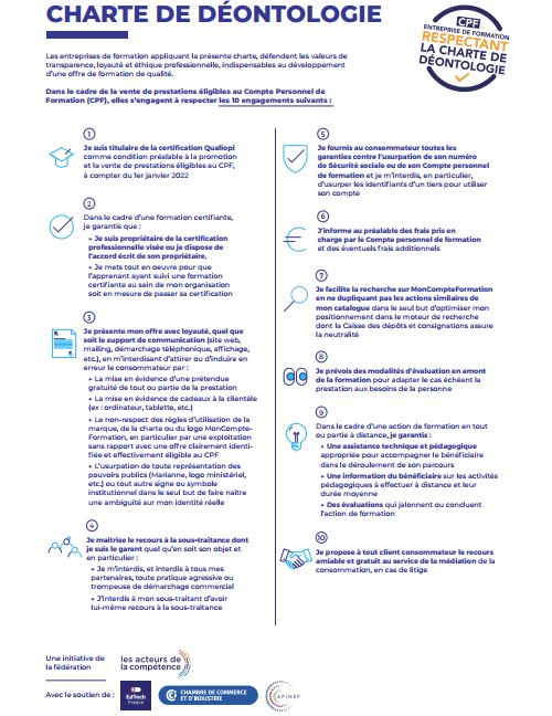 Dans le cadre de la vente de prestations éligibles au Compte Personnel de Formation (CPF), elles s’engagent à respecter les 10 engagements suivants :